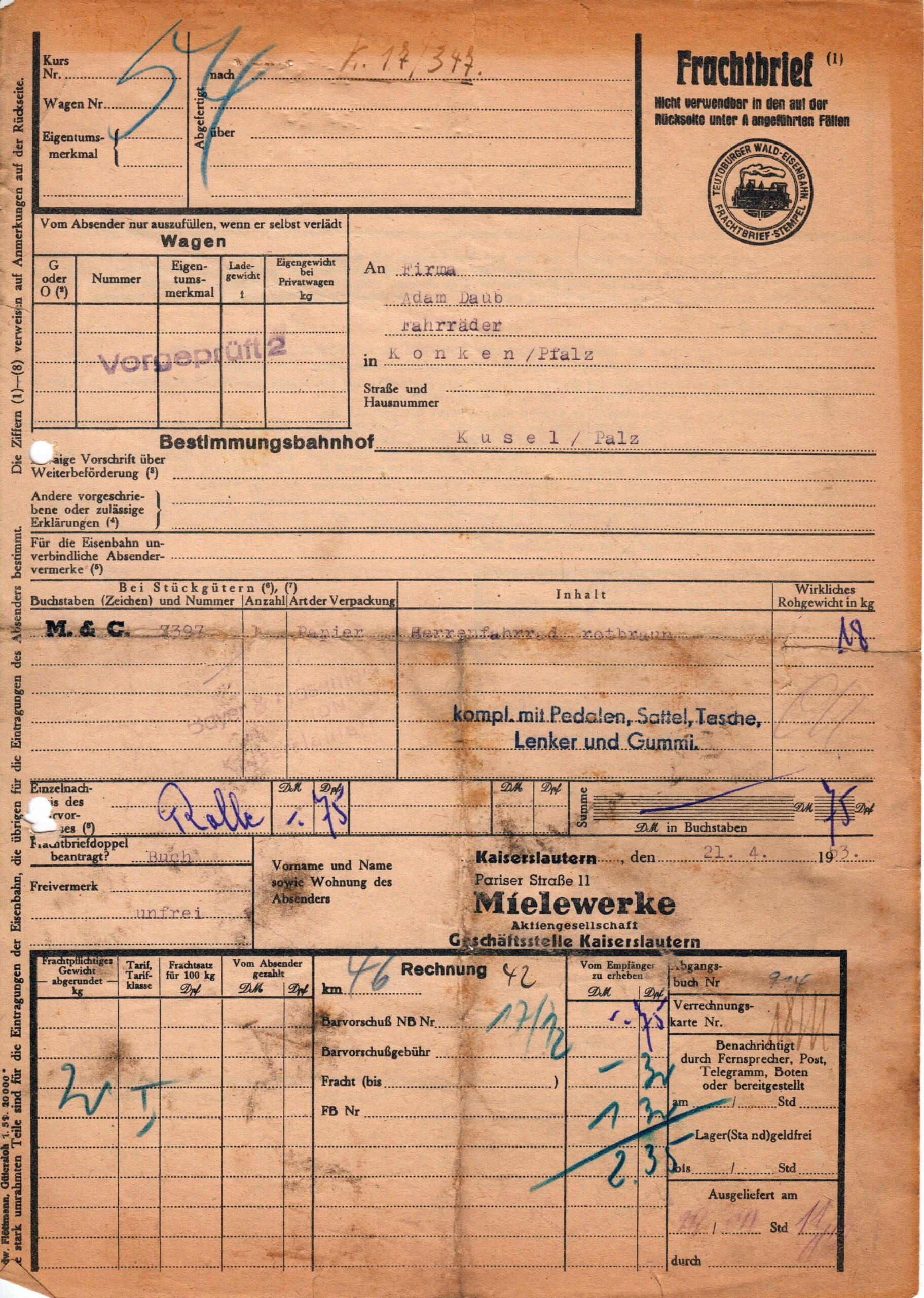 Frachtbrief der Teutoburger Wald-Eisenbahn