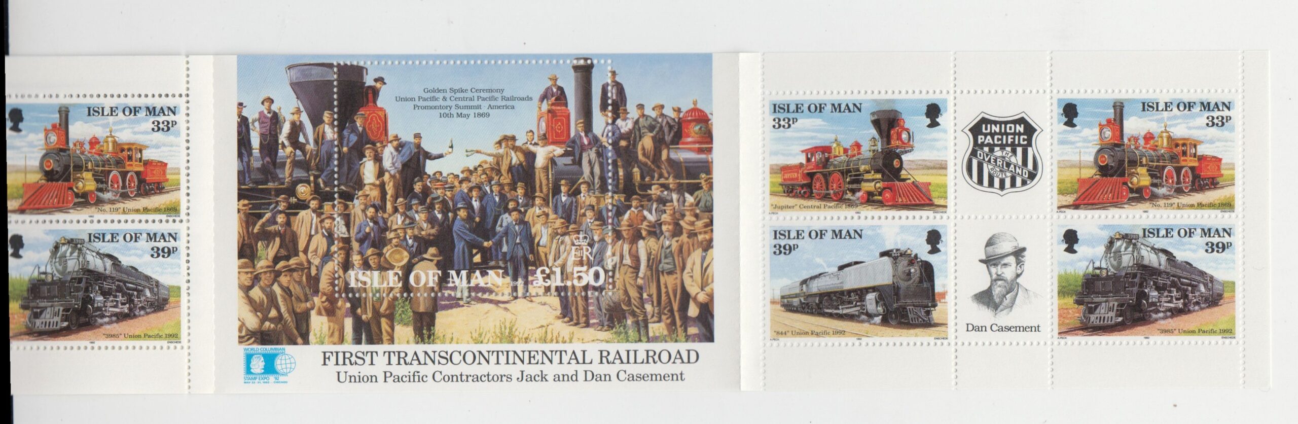 Tender-Lokomotiven “Jupiter” der Central Pacific im Jahr 1869 + “Lok #119” der Union Pacific auch im Jahr 1869 + “Lok #844” der Union Pacific im Jahr 1992 + “Lok #3985” der Union Pacific auch aus dem Jahr 1992.