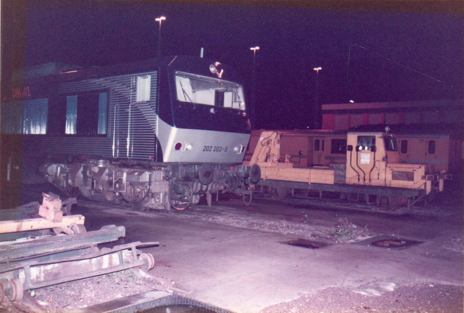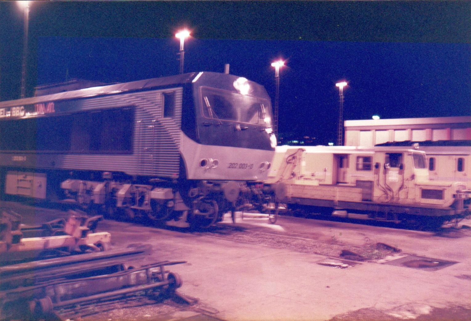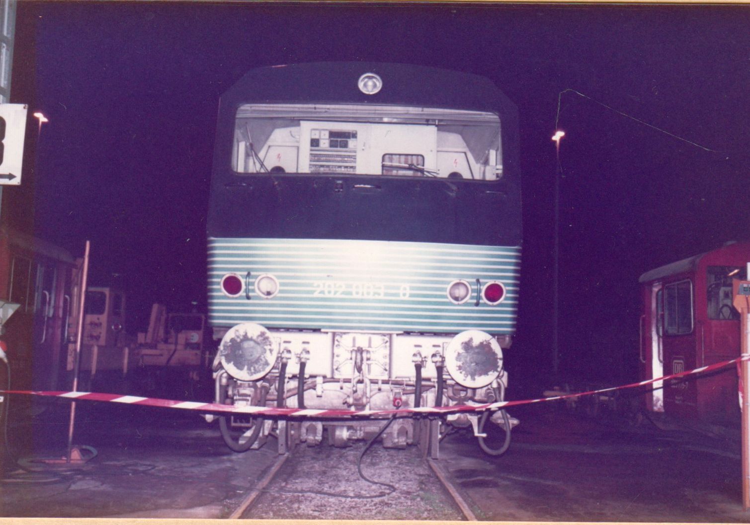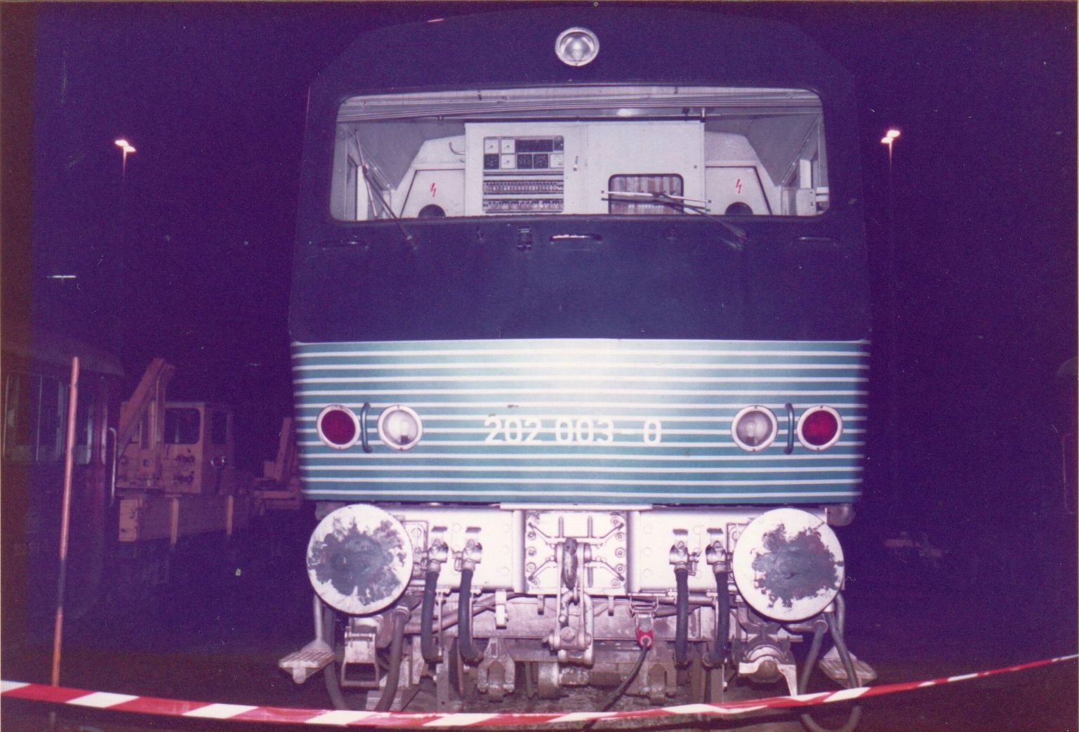 Alle hier gezeigten Bilder wurden im Dezember zur Nachtzeit im Jahr 1984 im Bw Kaiserslautern gefertigt. Die abgestellte Versuchslok wurde sogar mit Absperrbändern räumlich abgegrenzt, um unbefugten Zutritte zu verhindern.