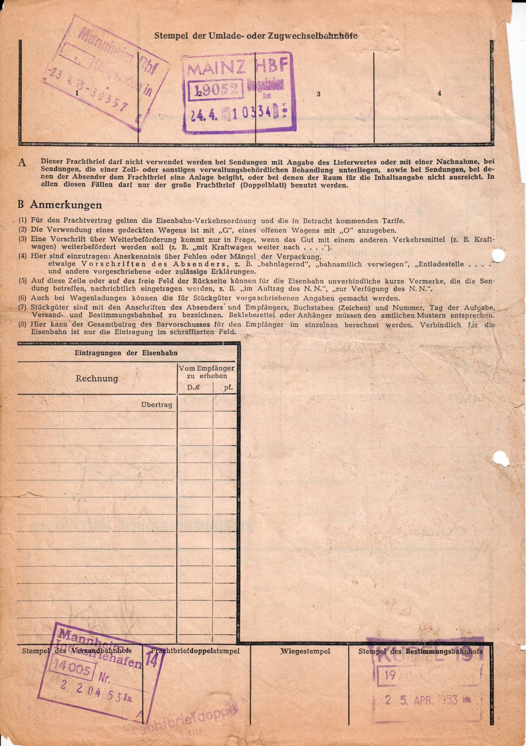 Frachtbrief der Deutschen Bundesbahn