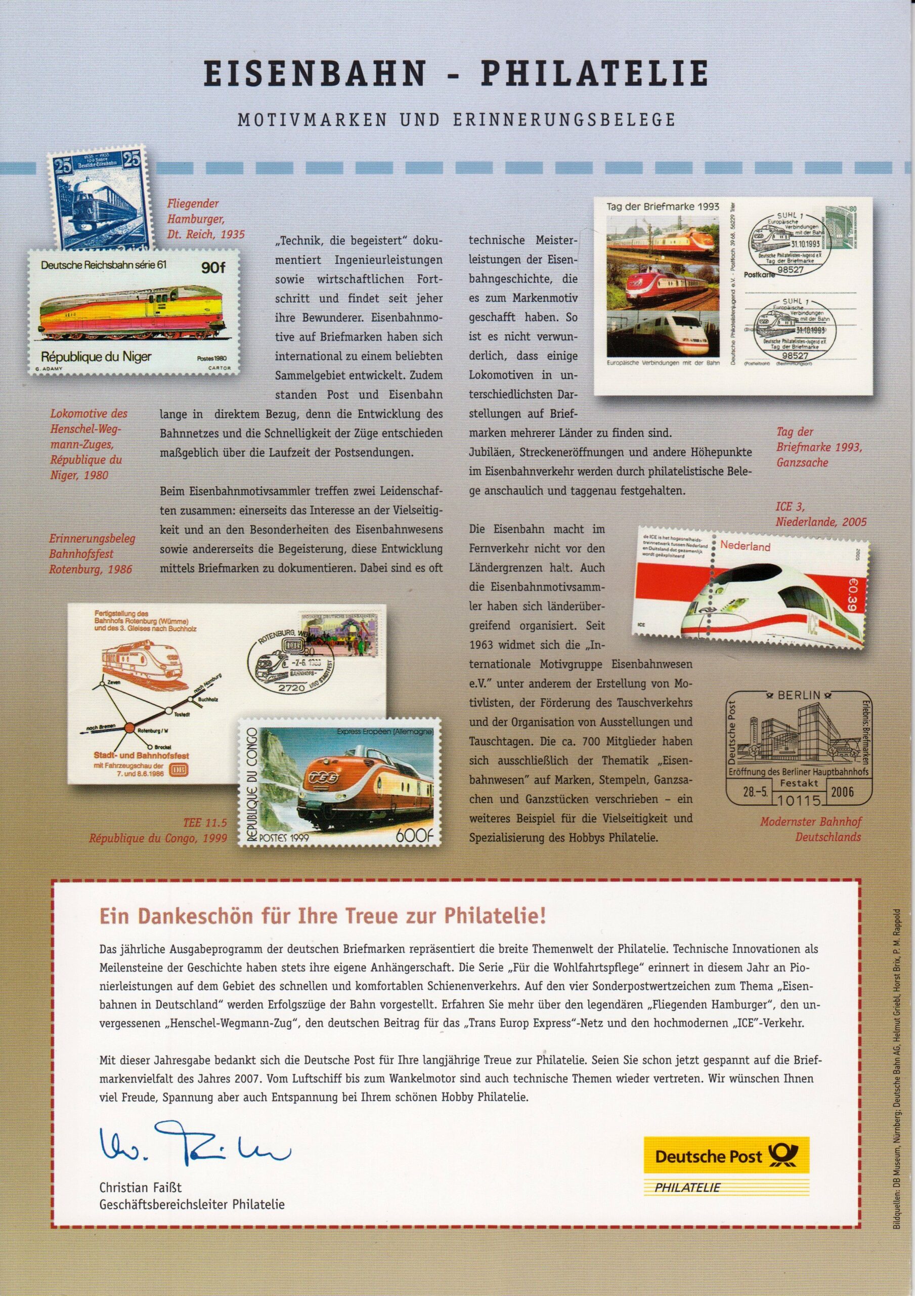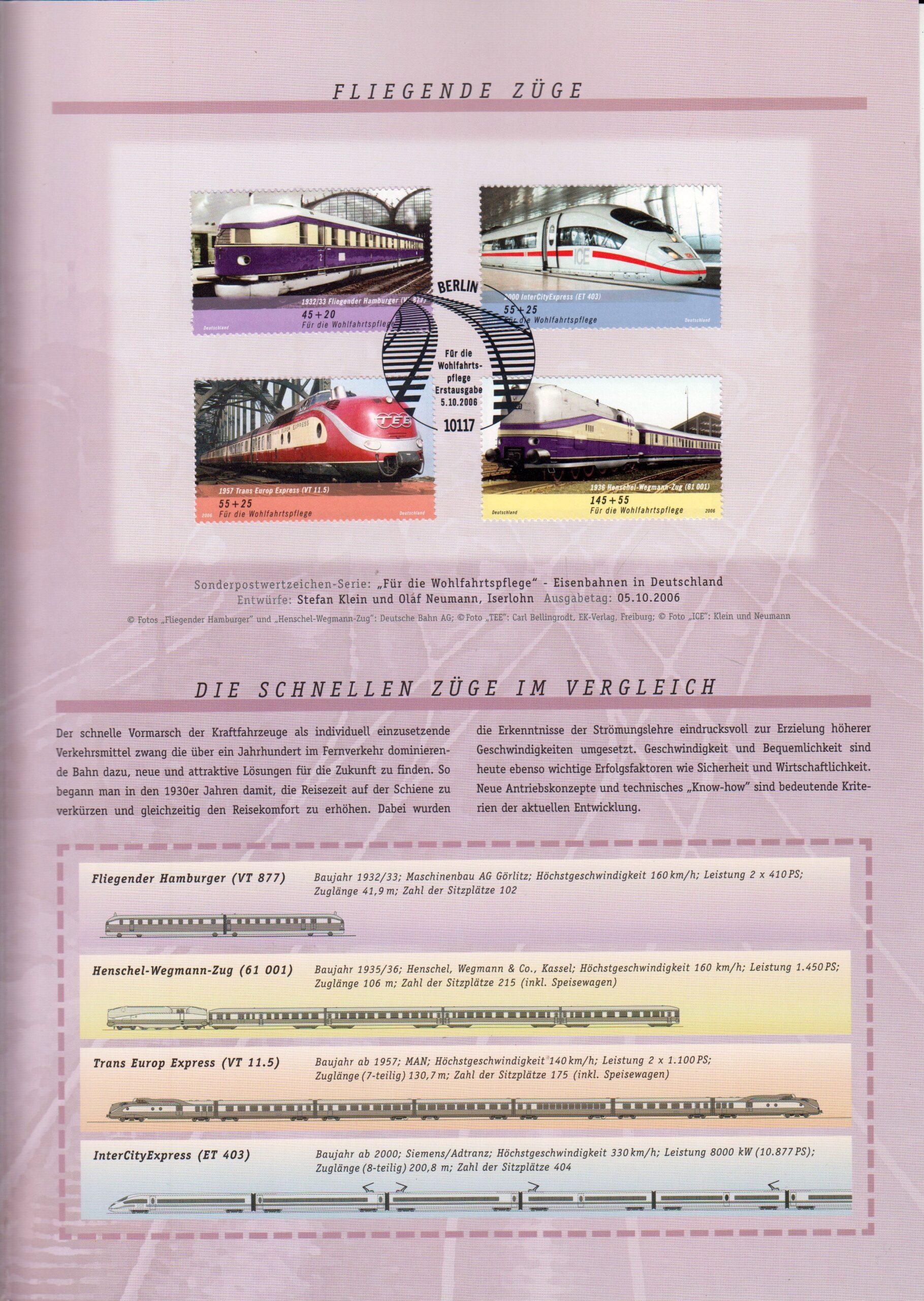 Ein exclusives Treublatt der Deutschen Post an die ABO-Kunden der Philatelie. Sehr detailreiche Beschreibung der “Fliegenden Züge” in Deutschland von 1933 bis heute. Auf Seite 3 sind alle vier Originalbriefmarken des am 05.12.2006 verausgabten Satzes mit einem Sonderstepel Berlin eingearbeitet.