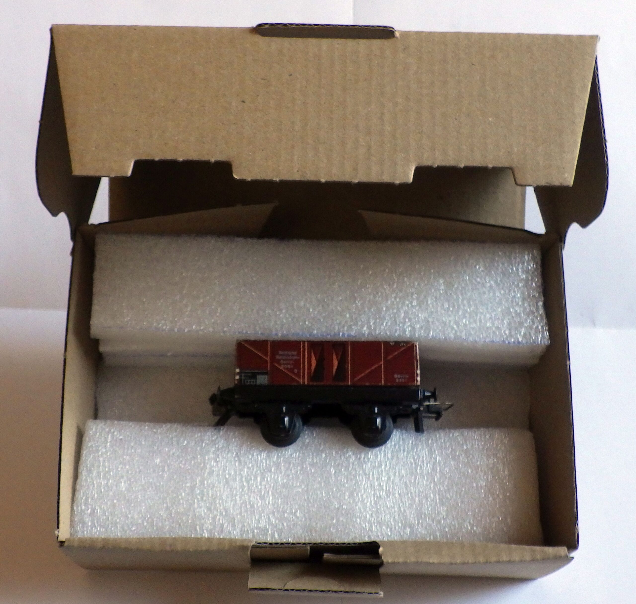Trix baute dieses Nachfolgemodell in den Jahren von 1938 bis 1940. Dieser “Mittelbordwagen” wurde durch neue Kupplungen aus Zink-Spritzguss mit Haken und Schaft in aluminiumfarben, sowie einem grauen Ausheber bestückt. Die Puffer waren jetzt kurze, gedrehte Metallpuffer, welche in einer Art “Vernietung” am Fahrgestell montiert waren.