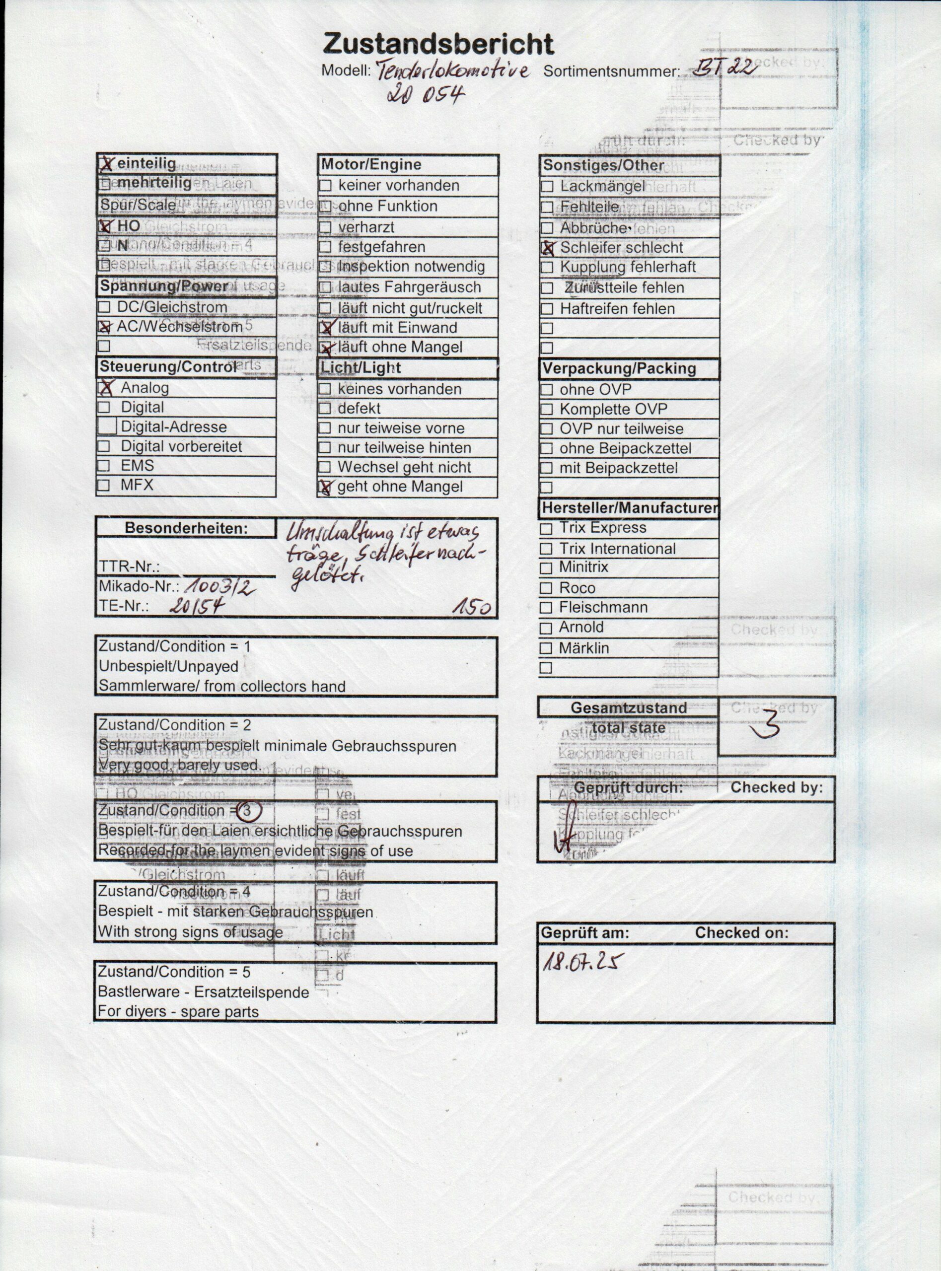 Ein sehr schöner Gesamtzustand unter Berücksichtigung des sehr guten Erhaltungszustandes der eingelegten Fahrzeuge. Für beide Lokomotiven ist jeweils ein Zustandsbericht beigefügt.