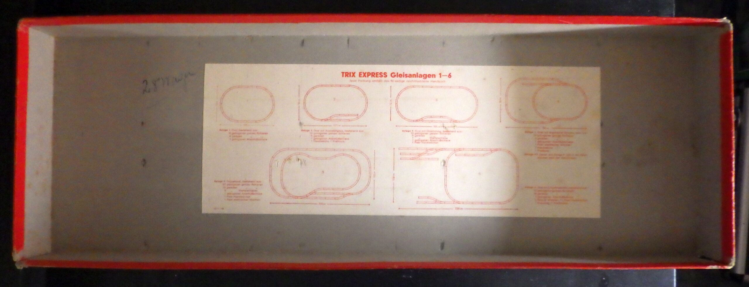 Der Umkarton ist seinem alter entsprechend in einem noch guten Zustand. Lediglich der Hinweis “Trix Gleisanlagen” wurde erneuert und ein Hochleistungstrafo ausgetauscht, da der ursprüngliche keine Funktion mehr hatte. Es fehlt die Ölflasche.